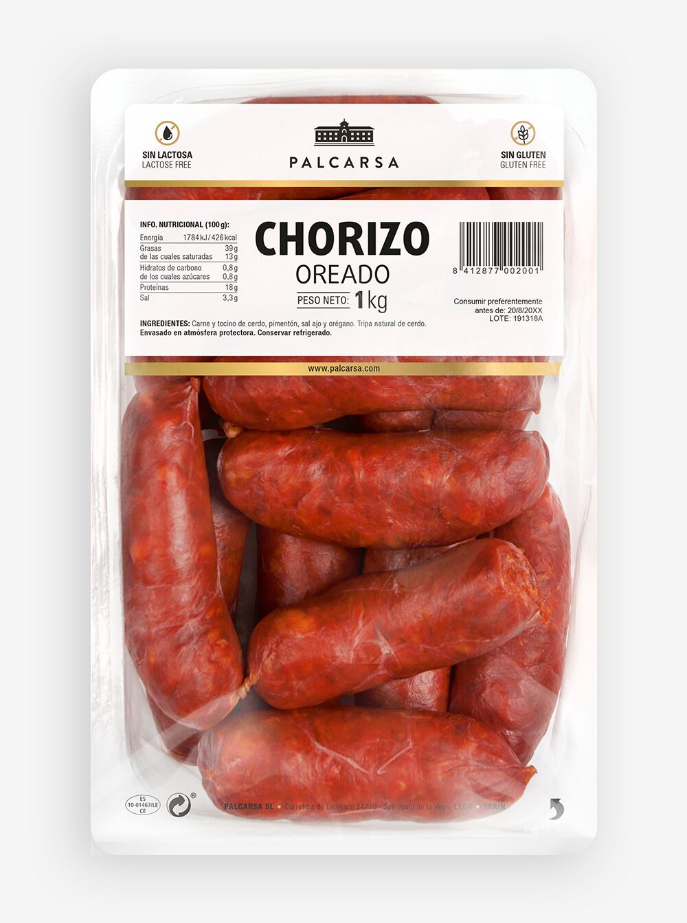 Carne y grasa de cerdo, pimentón, sal, ajo y orégano. Tripa natural de cerdo.